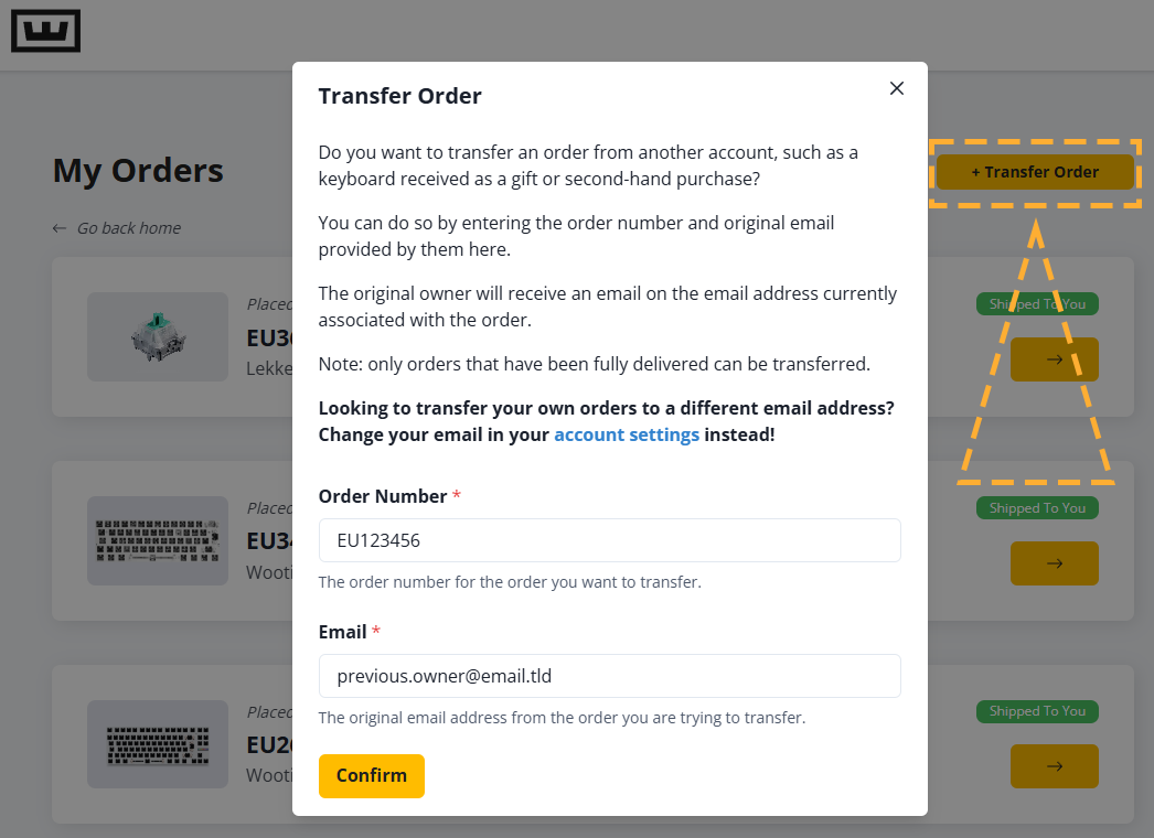 After confirmation, the original owner will receive an email to confirm the transfer. After confirmation, it'll complete the transfer. Now the order is available in the Wooting Hub for the new owner.